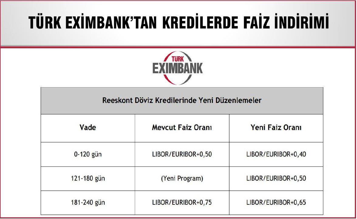 Ayrıca 6 aya kadar vade ile kullandırılacak Reeskont Döviz kredilerinde LIBOR/EURIBOR+0,50 faiz oranı uygulaması başlatılmıştır. Böylece bir yandan vade çeşitliliği artırılırken ihracatçıların katlandığı finansman maliyetleri de daha aşağı çekilmiştir.