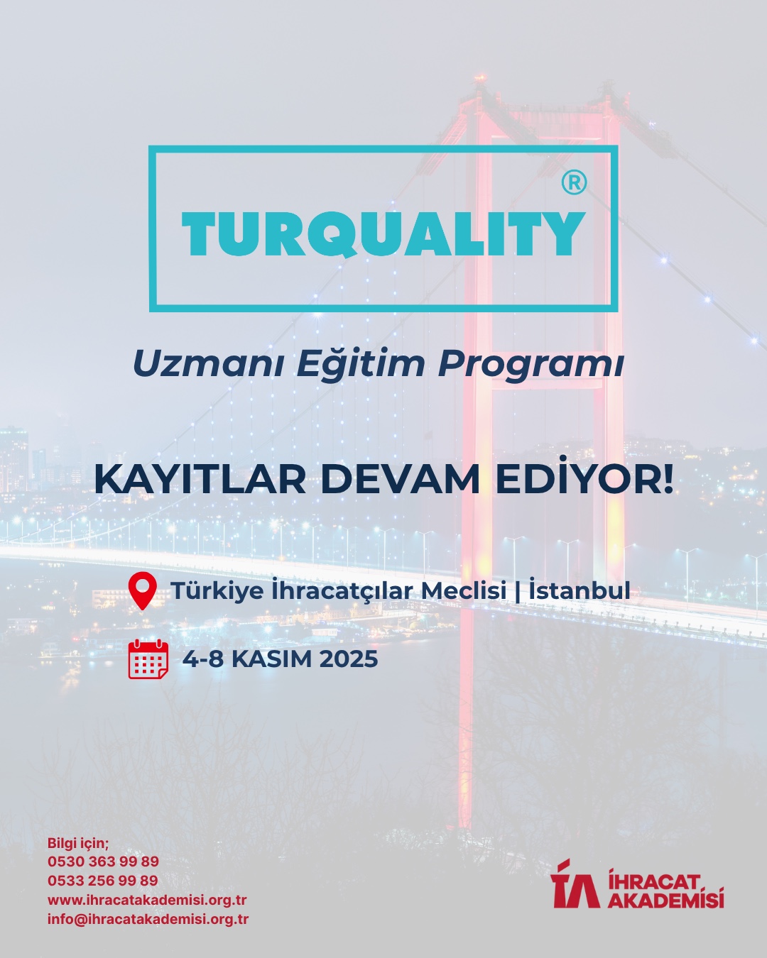 İlgili yazıda, Ticaret Bakanlığı'nın koordinasyonunda İhracat Akademisi çatısı altında 4 Kasım – 8 Kasım 2025 tarihlerinde TURQUALITY® Uzmanı Eğitimi'nin İstanbul'da Türkiye İhracatçılar Meclisi Şehit Ömer Halisdemir Konferans Salonu'nda gerçekleştirilmesinin planlanmakta olduğu, katılımın ücretli olduğu ve katılmak isteyen üyelerimizin Eğitim Programları | İhracat Akademisi bağlantısı üzerinden kayıt olabileceği ifade edilmektedir.
