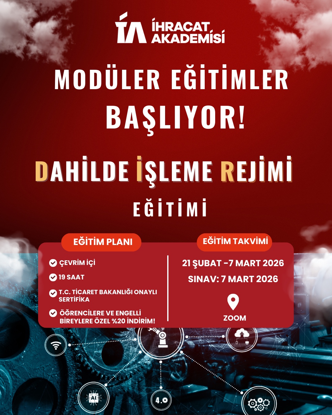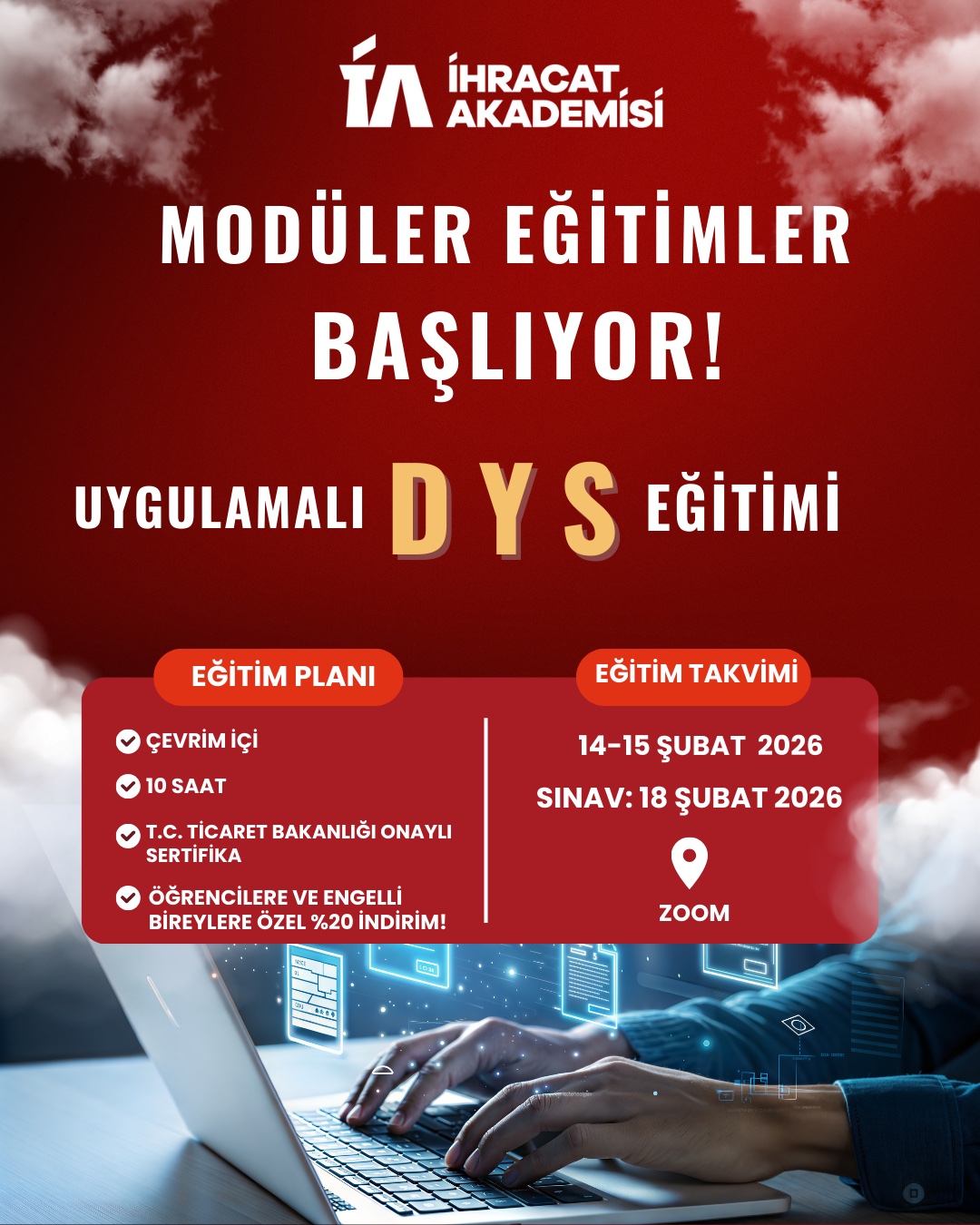 Bu minvalde, İhracat Akademisi bünyesinde, Ek-1'de yer alan program akışı kapsamında, 14- 15 Şubat 2026 tarihlerinde çevrim içi Destek Yönetim Sistemi (DYS) Eğitim Programı ve Ek-2'de yer alan program akışı çerçevesinde, 21 Şubat-7 Mart 2026 tarihleri arasında çevrim içi Dahilde İşleme Rejimi (DİR) Eğitim Programı gerçekleştirilecektir. Eğitim programlarının sonunda, 18 Şubat 2026 tarihinde DYS Eğitim Programı sınavı, 7 Mart 2026 tarihinde ise DİR Eğitim Programı sınavı çevrim içi ve çoktan seçmeli olarak gerçekleştirilecek olup, katılımcılara Ticaret Bakanlığı onaylı Katılım/Başarı Belgesi verileceği bildirilmektedir.