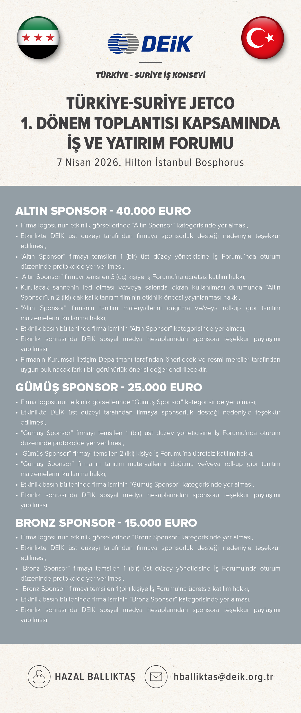 Dış Ekonomik İlişkiler Kurulu'ndan (DEİK) gelen 23.03.2026 tarih ve 262 sayılı yazıda; T.C. Ticaret Bakanı Sayın Prof. Dr. Ömer Bolat ve Suriye Arap Cumhuriyeti Ekonomi ve Sanayi Bakanı Sayın Prof. Dr. Muhammed Nidal eş-Şaar eş başkanlıklarında gerçekleştirilecek Türkiye-Suriye JETCO I. Dönem Toplantısı vesilesiyle, 07 Nisan 2026 tarihinde, ikili iş görüşmeleri eşliğinde ve iş dünyası temsilcilerinin katılımlarıyla, 11.15- 16.00 saatleri arasında Hilton İstanbul Bosphorus'ta Türkiye-Suriye İş ve Yatırım Forumunun düzenleneceği belirtilmektedir.