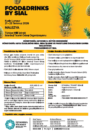 Food & Drink Malaysia by SIAL 2026 Fuarı, 21–23 Temmuz 2026 tarihleri arasında Malezya'nın başkenti Kuala Lumpur'da düzenlenecek olup, Türkiye Milli İştirak Organizasyonu'nun İstanbul Ticaret Odası tarafından gerçekleştirilmesi planlanmaktadır.