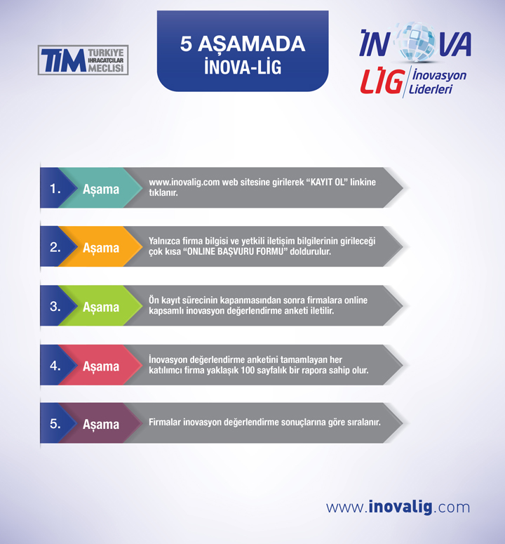 Bilindiği üzere, Türkiye'nin ilk inovasyon geliştirme programı olan ve ülkemizin inovasyon şampiyonlarını belirleyen İnovaLİG programının bu yıl Türkiye'de 3. kez gerçekleştirileceği, İnovaLİG 2015'te ulaşılan 488 başvuru sayısı ile Türkiye, IMP3rove programına katılımın en yüksek olduğu ülkelerden biri haline gelmeyi başardığı, 2015 yılının kazananları Sayın Cumhurbaşkanımızın katılımı ile Türkiye İnovasyon Haftası'nda ödüllerini aldığı, bu yıl Türkiye'yi Avrupa'da temsil edeceği, İnovaLİG ile şirketler hem inovasyon yetkinlikleri bazında yarışmakta hem de inovasyon kültürlerini interaktif bir platformda geliştirme fırsatı bulduğu ve İnovasyon değerlendirmesini tamamlayan her firmaya, yaklaşık 100 sayfalık kapsamlı inovasyon değerlendirme ve kıyas analizi raporu ücretsiz olarak sunulduğu, bu anlamda İnovaLİG sayesinde firmalarımızın orta ve uzun vadeli hedeflerine odaklanmasına, yıllar içerisinde inovasyon gelişimlerini takip edebilmelerine ve gözlemlemelerine imkân sağlamakta oldukları belirtilerek, Özellikle ihracatçı firmalarımızın 2023 hedeflerine ulaşma noktasında hangi konumda olduklarına ayna tutmakta ve 2023'e giden vizyonu belirlemekte oldukları ifade edilmekte olup, bu kapsamda ihracatçılarımızı hem inovasyon gelişimlerini görmesi, hem de küresel şampiyona heyecanına ortak olmaları için 31 Mayıs 2016 tarihine kadar www.inovalig.com adresinden İnovaLİG 2016'ya katılmaya davet etmekte oldukları belirtilmektedir.